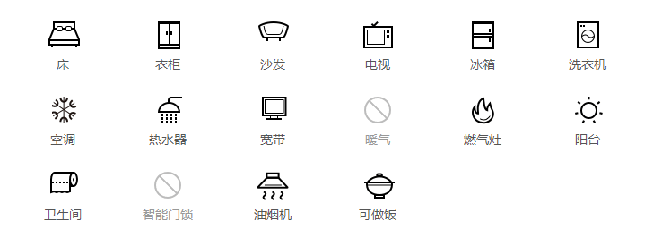 1、基本配置:精装修,双人床,衣柜,电脑桌,凳子,冰箱,全自动洗衣机,24热水。