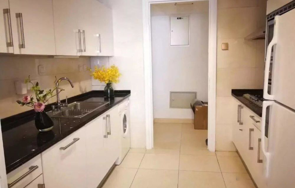 3)厨房:橱柜、双开门冰箱、抽油烟机、双水槽、整洁大方。